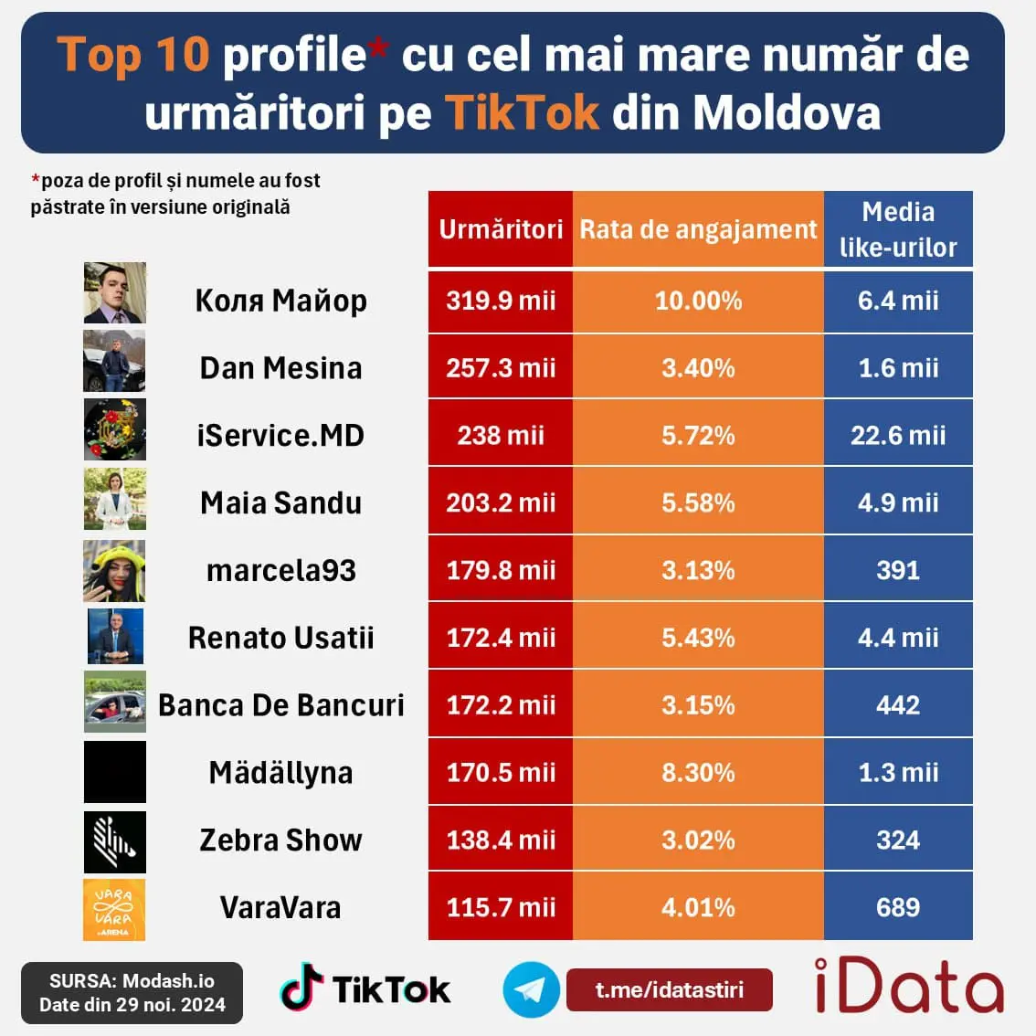 Surpriza vine de la Maia Sandu, președinta Republicii Moldova, care ocupă locul 4, având 203.200 de urmăritori și o rată de angajament de 5,58%. Alte conturi populare includ marcela93, Renato Usatîi și Zebra Show, demonstrând diversitatea conținutului de pe platformă.