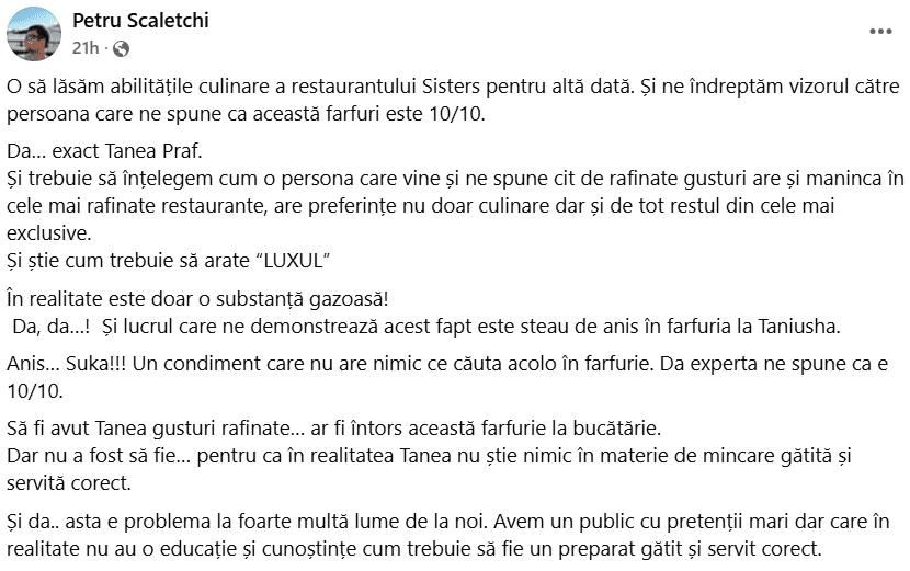 „O să lăsăm abilitățile culinare ale restaurantului pentru altă dată și ne îndreptăm atenția asupra persoanei care ne spune că această farfurie este 10/10. Da… exact, Tanea Praf. Cum poate o persoană care pretinde că are gusturi rafinate să aprecieze așa ceva?”, a comentat Petru Scalețchi, ironizând recomandările influencerei.