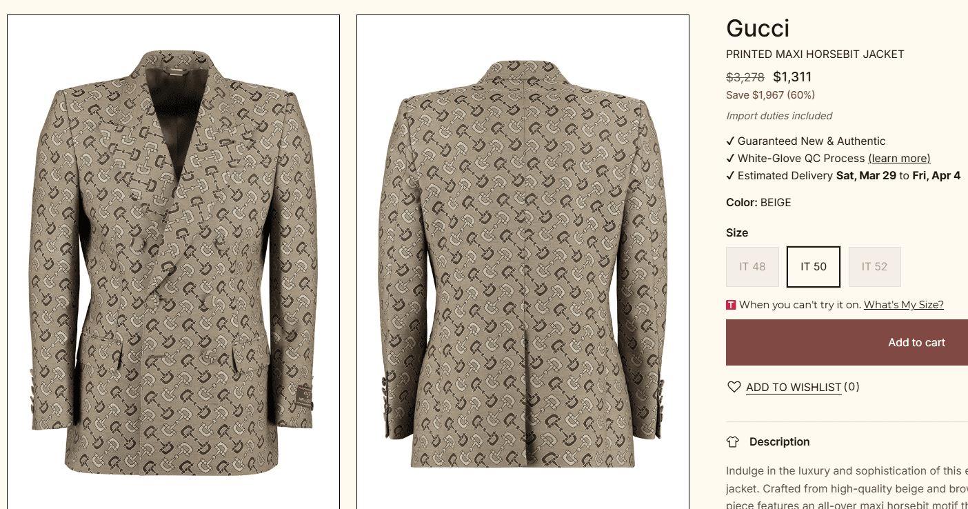 Costumul face parte dintr-o colecție mai veche și nu se regăsește momentan pe site-ul oficial Gucci. Pe alte platforme însă, doar jacheta semnată de celebra casă de modă costă circa 1.300 de dolari, fiind la reducere, pantalonii nu se regăsesc în stoc.