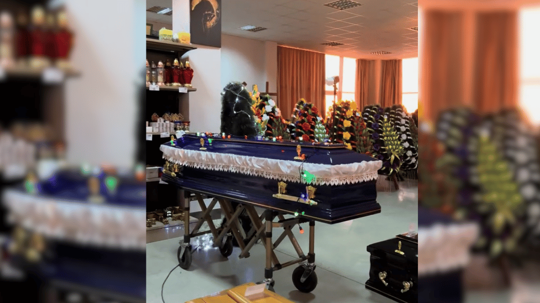 Nu s-a mai văzut așa ceva! Magazin cu articole funerare de la noi, decorat de Crăciun! Au ornat chiar și sicriul