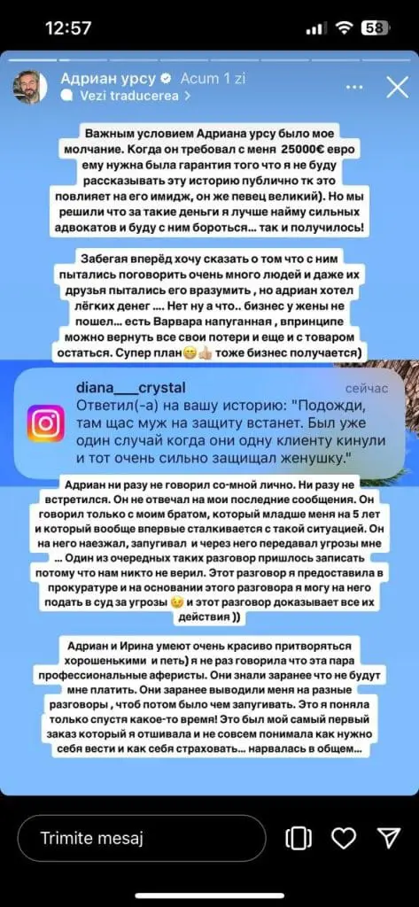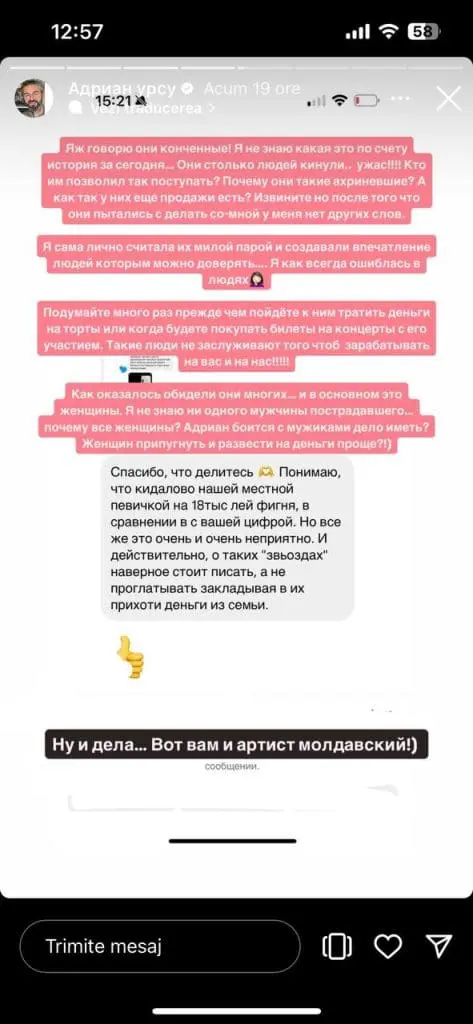 O tânără care se prezintă în mediul online drept Varvara Oprea, fondatoarea unui brand de haine, s-a plâns pe Instagram precum că de mai bine de doi ani nu-și poate primi banii de la cântărețul Adrian Ursu și soția lui, Irina Negara. Femeia spune că aceștia i-ar datora 180 de mii de lei, pentru executarea unei partide de 700-800 de pijamale la comandă. Aceasta a atașat mesajul pe care i l-a expediat lui Ursu, în care îi spune să nu-i amenințe afacerea, întrucât nu mai trăim în anii ’90. Vedeți aici textul integral.