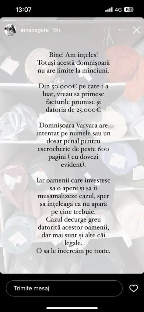 Irina Negara a venit cu o reacție pe pagina sa de Instagram. Soția lui Adrian Ursu spune că cea care îi învinuiește de neachitarea taxelor este vizată într-un dosar pentru escrocherie. Irina pretinde la rândul său 25 de mii de euro și facturi.