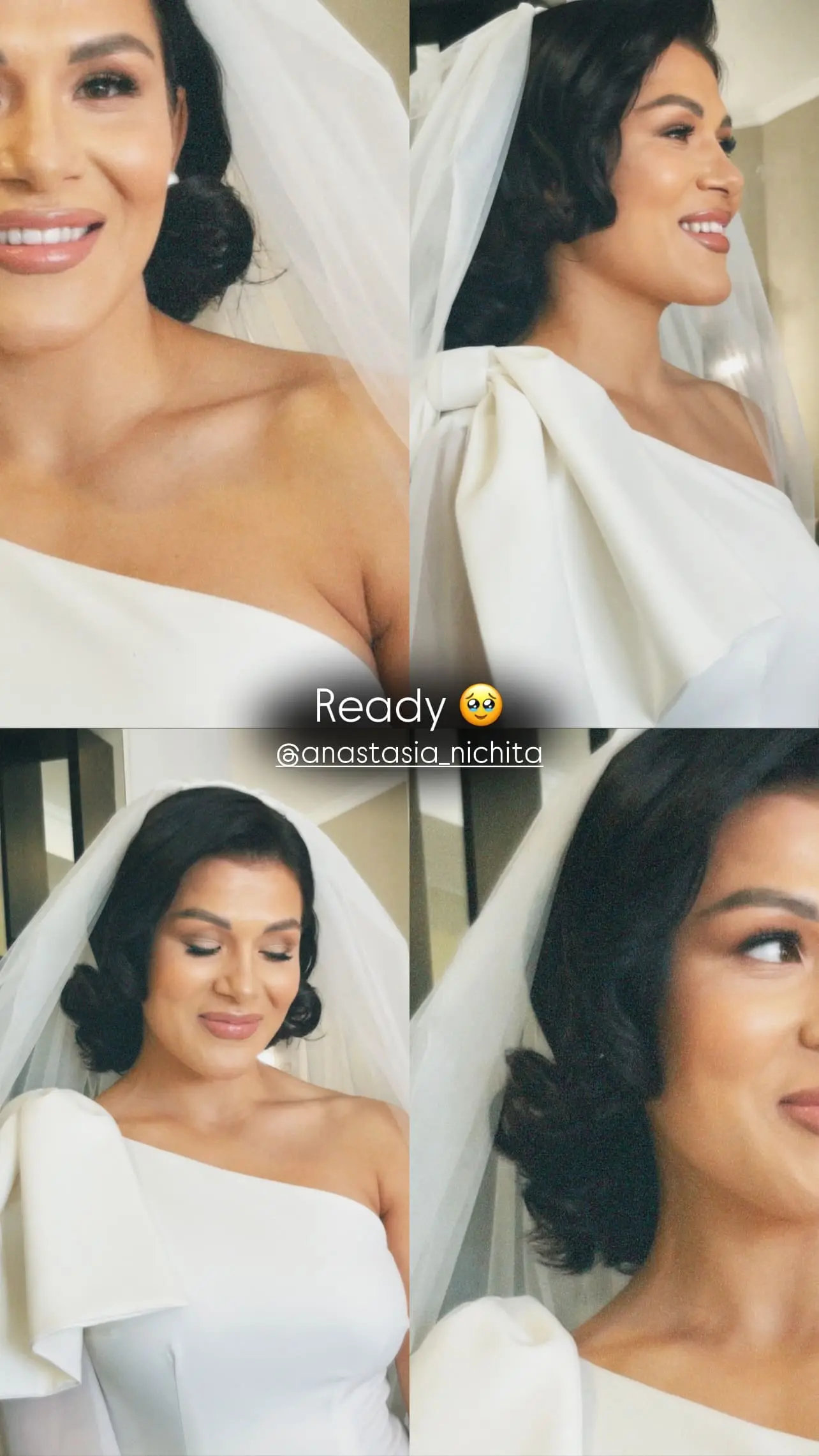 Luptătoarea radiază de fericire, purtând voalul de mireasă, o rochie elegantă, cu un umăr dezgolit și altul pus în evidență de o fundă.