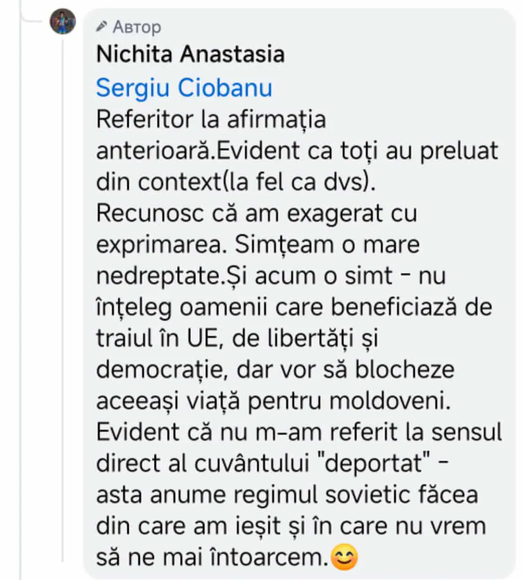 Într-un comentariu recent pe rețelele sociale, Anastasia Nichita a revenit asupra afirmațiilor, recunoscând că „a exagerat cu exprimarea”. Aceasta a explicat că nu s-a referit la sensul propriu al termenului „deportare”, ci a fost o reacție emoțională în fața a ceea ce a perceput drept o mare nedreptate. „Nu înțeleg oamenii care beneficiază de viața în UE, dar blochează acest drum pentru ceilalți”, a comentat ea.