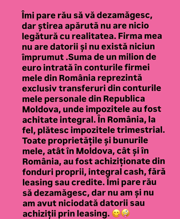 După ce CanCan.ro a dezvăluit datoriile firmei sale, Andreea a negat public că ar avea datorii. Tânăra a scris pe Instagram că toate bunurile și le-a cumpărat cu bani cash și nu are nici măcar un credit luat la bancă.