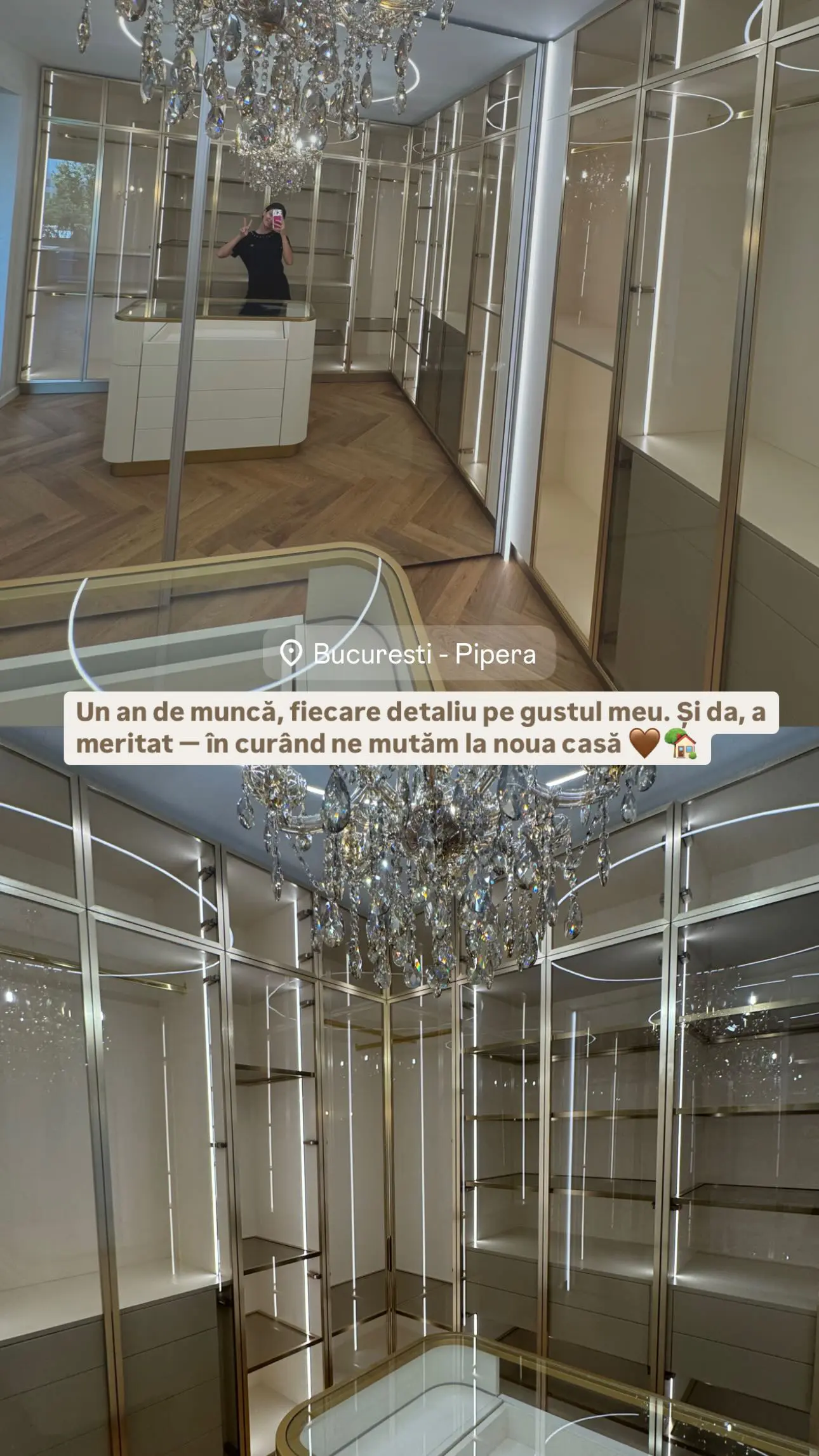 Andreea a postat imagini din garderoba sa, o cameră în care domină nuanța aurie, cu o mulțime de dulapuri și rafturi pentru ținutele și accesoriile sale de lux. Tânăra a postat și câteva imagini din camera de baie și living.