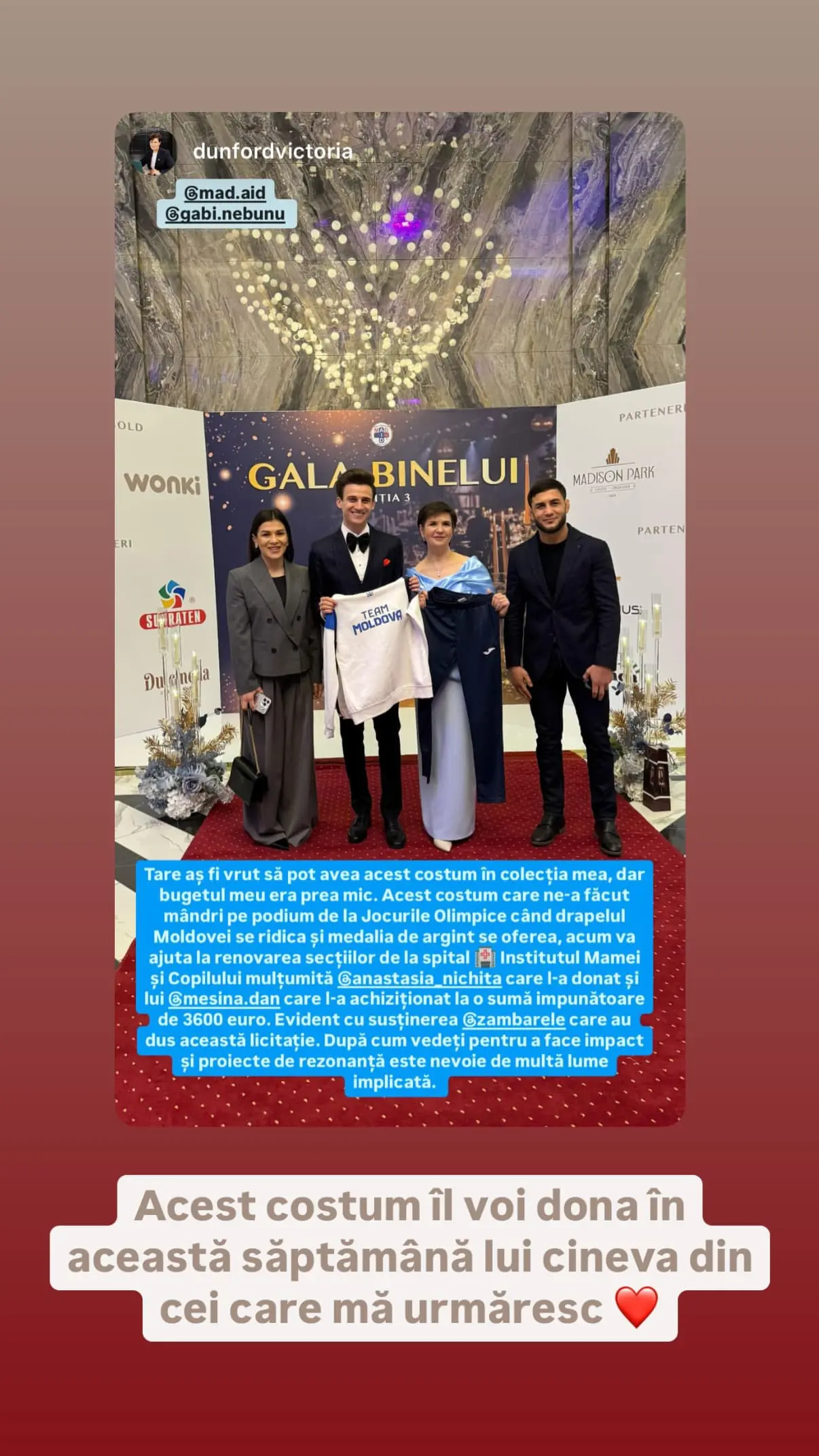 Costumul de sport pe care l-a purtat Anastasia Nichita la Jocurile Olimpice de la Paris vara trecută, în urma cărora a revenit acasă cu medalia de argint obținută la lupte libere, devenind „sportiva de aur” a Moldovei”, a fost scos la licitație în cadrul Galei Binelui organizat de Victoria Dunford de la Mad-aid și cântărețul de muzică populară Gabi Nebunu, ambasador al proiectului. Cea mai mare sumă a fost dată de antreprenorul Dan Meșina.