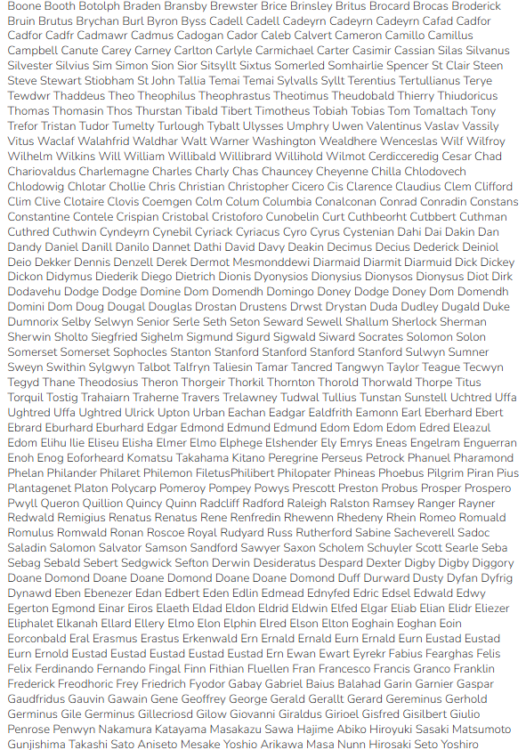 După o lună de deliberări, Watkins a plătit 400 de dolari neozeelandezi pentru ca un dactilograf să îi scrie numele pe hârtie. S-a inspirat din nume latine, anglo-saxone, figuri celebre, cărți de nume pentru bebeluși și din dicționarul maori. Deși nu are legături culturale maori, Watkins a spus că „admiră oamenii care vorbesc această limbă”. Lista sa includea nume precum Love, Florence și Basil Brush. A adăugat și nume samoane, japoneze și chineze, inclusiv „Xiao” scris ca „Shal”. De asemenea, a inclus Gaylord, în onoarea gimnastului american Mitch Gaylord, medaliat cu aur la Olimpiada din 1984. „Era un tip foarte chipeș, așa că i-am furat numele de familie”, a spus Watkins. „Dar numele meu preferat este AZ2000, ceea ce înseamnă că am peste 2.000 de nume de la A la Z”.