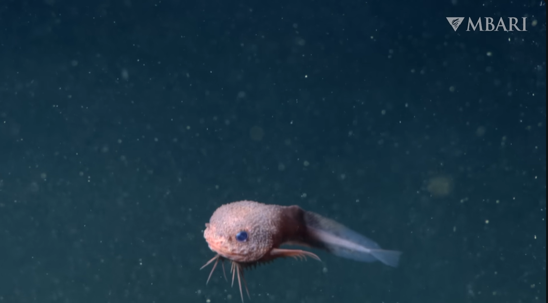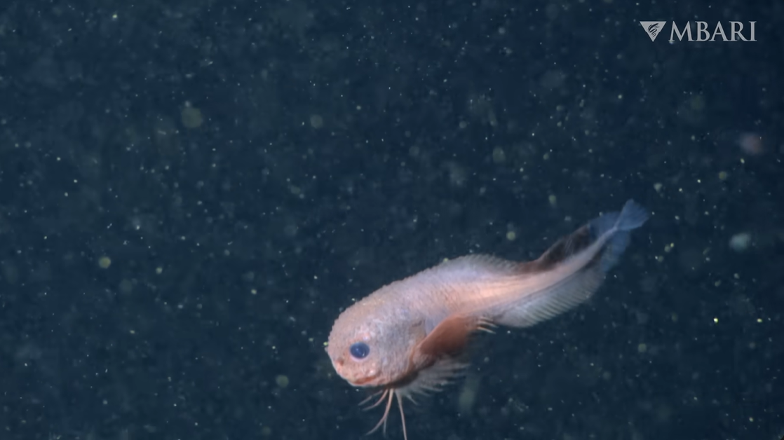 Un pește roz, cu denivelări, ochi albaștri și apendici asemănători unei bărbi a fost filmat plutind deasupra fundului noroios al Canionului Monterey, la o adâncime de peste 3.300 de metri, în largul coastei Californiei, potrivit Live Science.