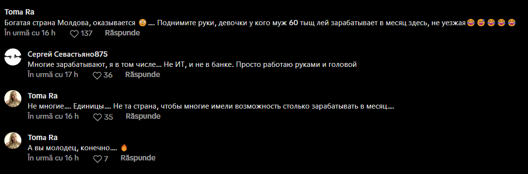Bloggerița a spus că se mulțumește cu un salariu de 60 de mii de lei lunar, bani care acoperă viața cotidiană, fără necesități exagerate. Femeia mai spune că nu ia bani de la soț, întrucât câștigă suficient, dar îi este confortabil să știe că traiul lor poate fi asigurat doar de soț, în caz de necesitate.