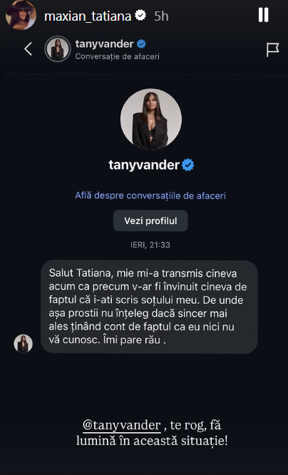 Recent Tany Vander a postat un video în care spune că o oarecare tiktok-eriță, care își prezintă activ relația de cuplu pe online, i-ar fi propus insistent o întâlnire romantică soțului, Vasile Lungo, dar fără succes. Suspiciunile internauților au căzut pe Tatiana Maxian, afaceristă căsătorită cu interpretul Ilie Maxian și mama a trei copii. Aceasta a venit cu o reacție negând cu vehemență acuzațiile, dar gurile rele au continuat să șoșotească că ea ar fi cea la care s-a referit Vander. Văzând că situația degenerează, iar acuzațiile curg gârlă peste influencerița din Florești, aceasta a rugat-o pe Vander să facă claritate la acest subiect.