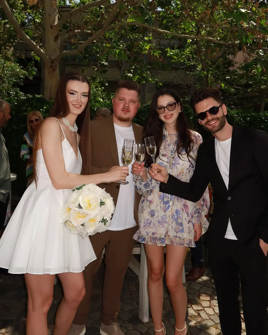 Astăzi a avut căsătoria civilă a îndrăgostiților. Pentru acest eveniment, nașa a ales o rochie diafană și scurtă, iar nașul a purtat un costum negru asortat cu tricou, în spiritul trendurilor actuale.