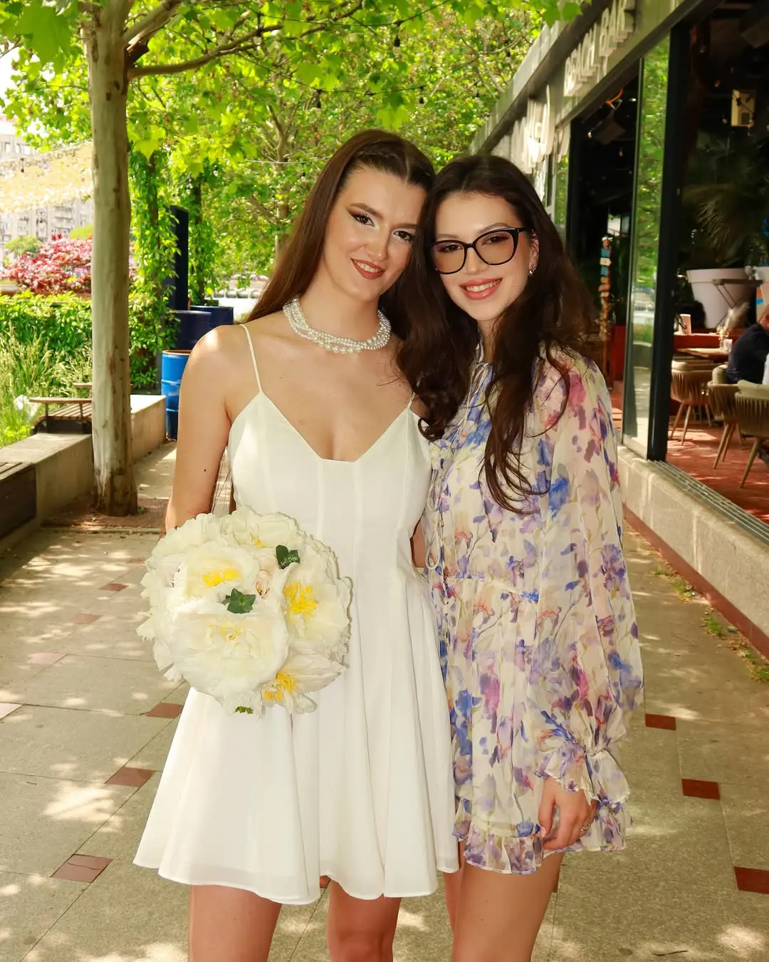 Astăzi a avut căsătoria civilă a îndrăgostiților. Pentru acest eveniment, nașa a ales o rochie diafană și scurtă, iar nașul a purtat un costum negru asortat cu tricou, în spiritul trendurilor actuale.