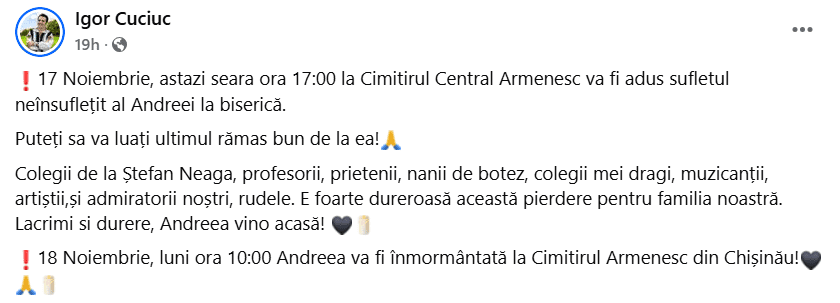 „E foarte dureroasă această pierdere pentru familia noastră. Lacrimi și durere, Andreea, vino acasă!”, a scris Igor Cuciuc.