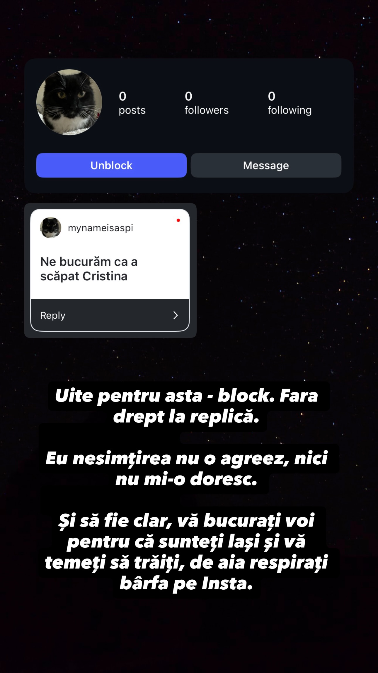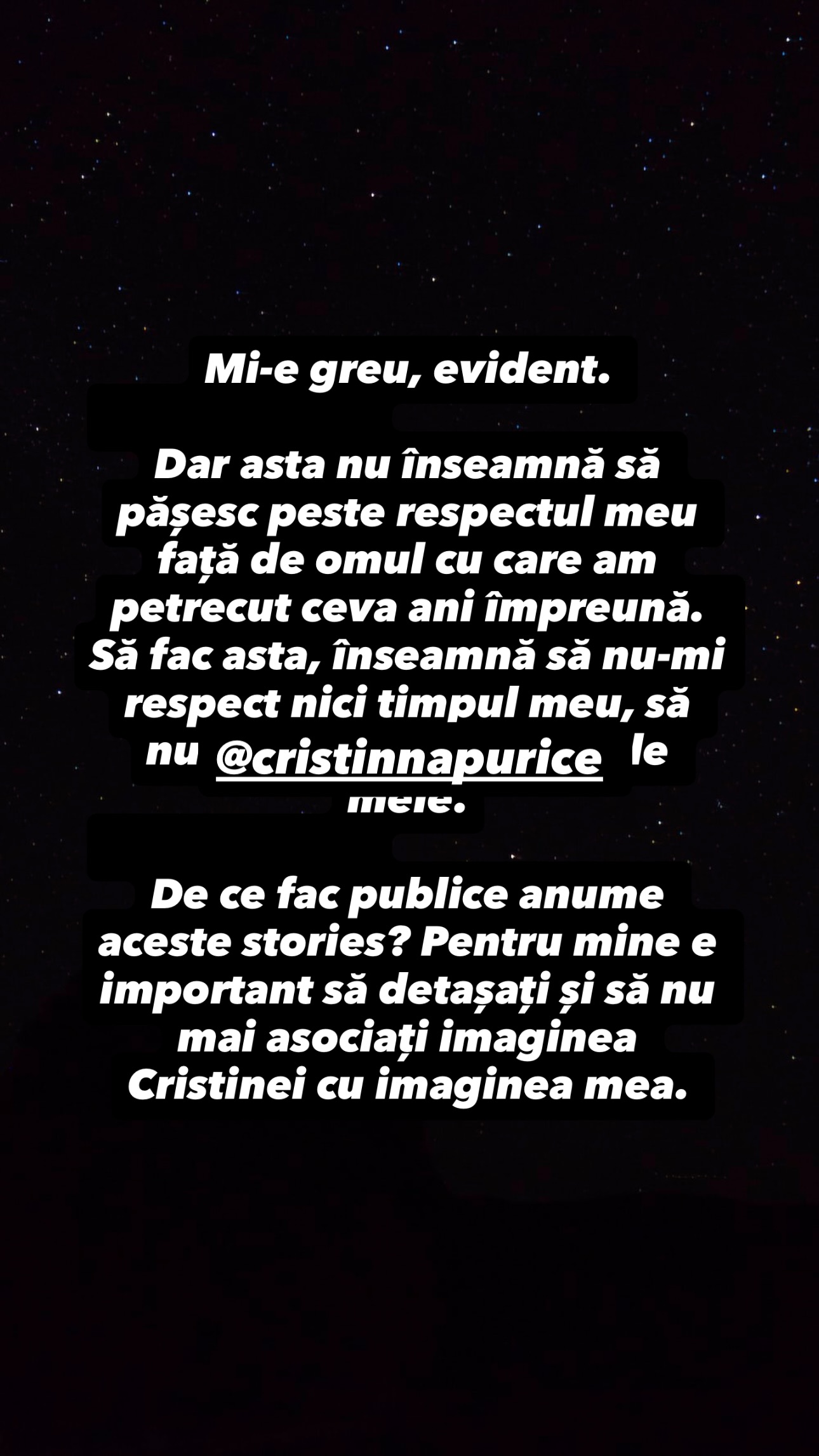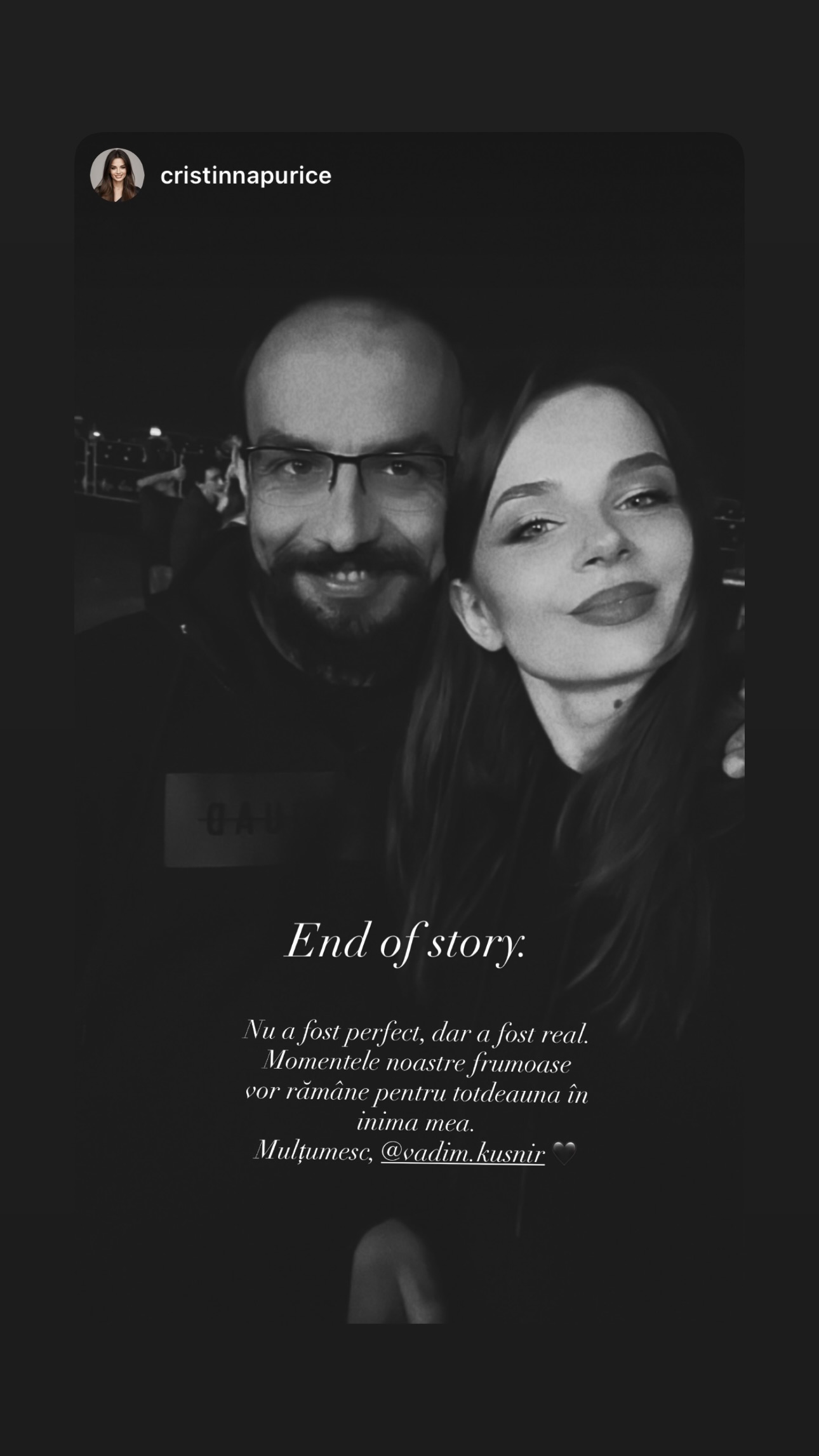 Cristina a postat și ea o fotografie din timpul relației lor. I-a mulțumit lui Cușnir pentru momentele frumoase comentând că nu a fost perfect, dar a fost real.