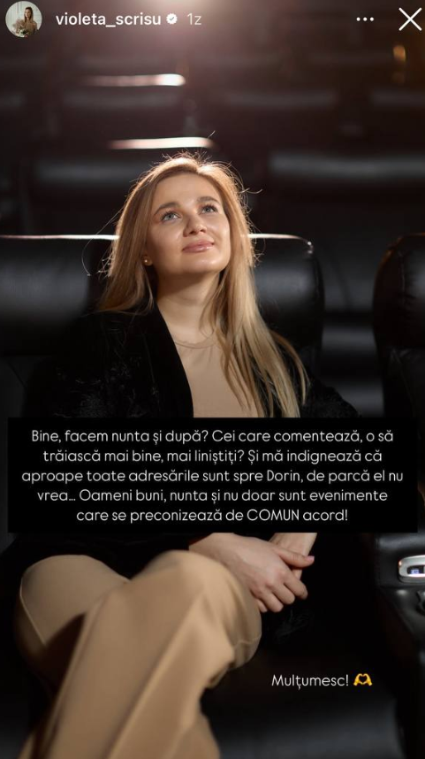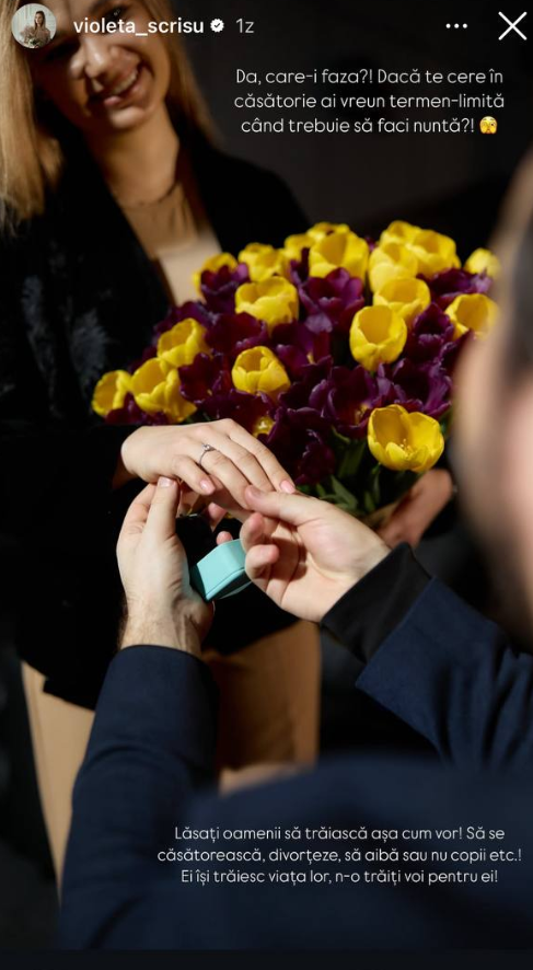A trecut mai bine de un an de când jurnalistul Dorin Galben a îngenunchiat în fața iubitei sale, Violeta Scrișu și a cerut-o de mireasă, însă cuplul nu se grăbește să facă următorul pas. Se pare că cei din anturajul lor sunt curioși să afle când logodnicii își vor oficia relația și dacă nu s-au răzgândit să o facă. Specialista în bune maniere, Violeta Scrișu se arată deranjată de excesul de curiozitate și de faptul că oamenii așteaptă anume de la Dorin decizia privind nunta. „De parcă el nu vrea. . .”