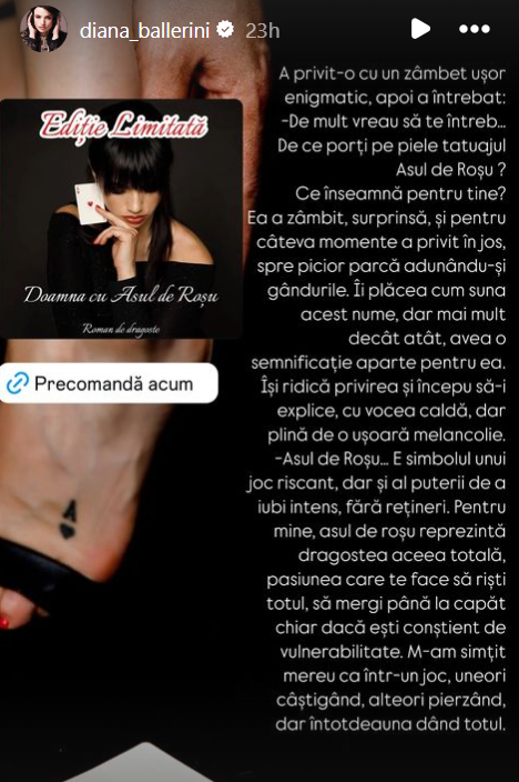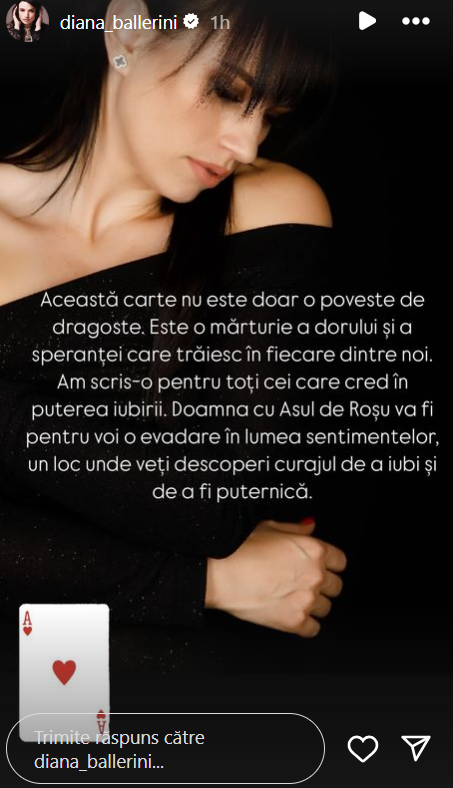 Afacerista Diana Ballerini și fosta arhitectului italian, a cărui nume de familie a rămas să-l poarte – se lansează în literatura beletristică. Femeia de afaceri a scris un roman de dragoste intitulat „Doamna cu Asul de Roșu”. Scriere care, promite ea, va oferi palpitații tari cititorilor.