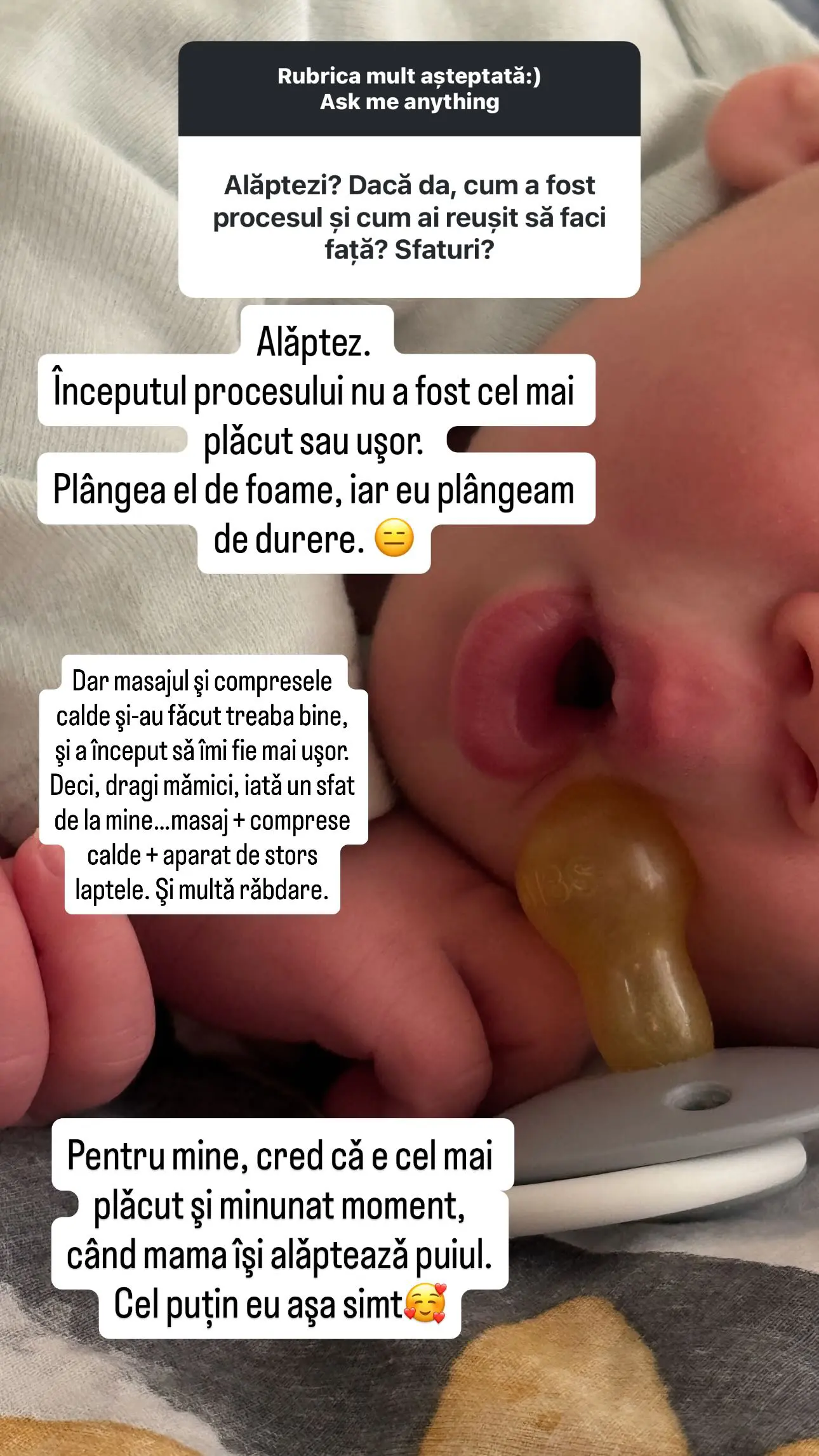 Proaspăta mămică alăptează și recunoaște că procesul a început cu năbădăi și că a uitat de odihnă, majoritatea nopților fiind albe. Tânăra însă are norocul să aibă ajutoare de încredere. Sora și mama îi sunt alături și au grijă împreună de bebeluș.