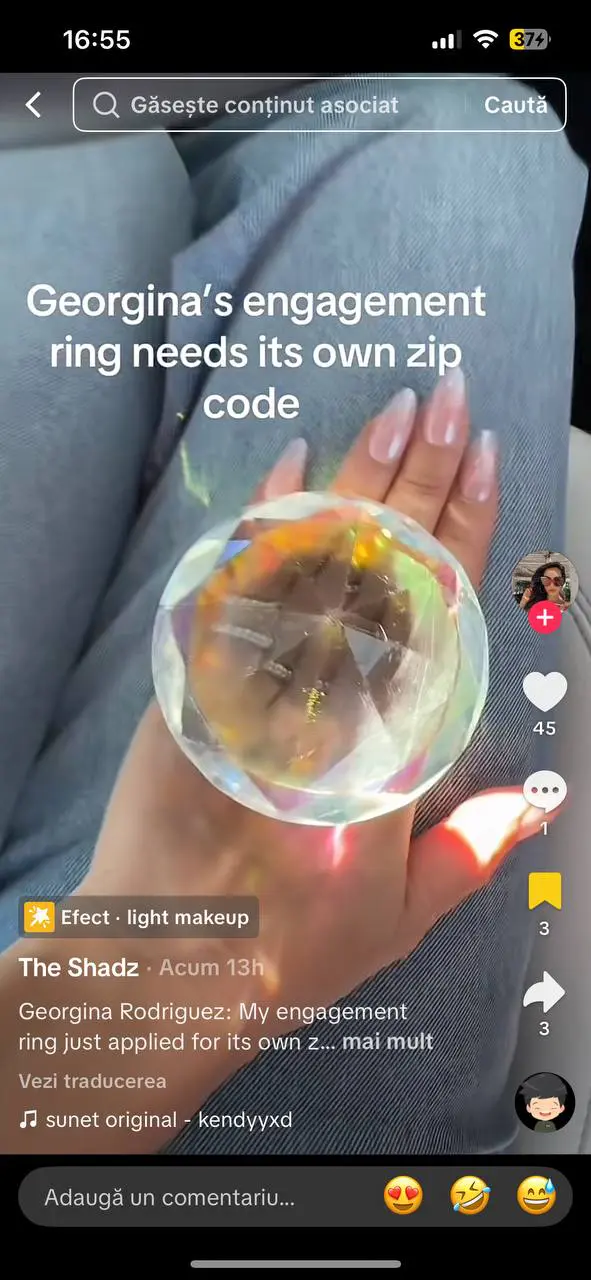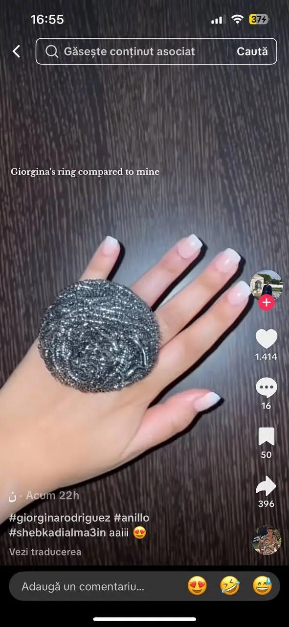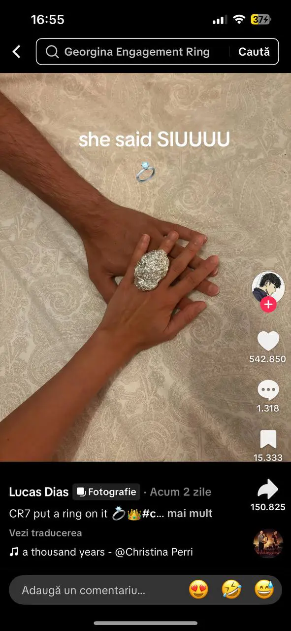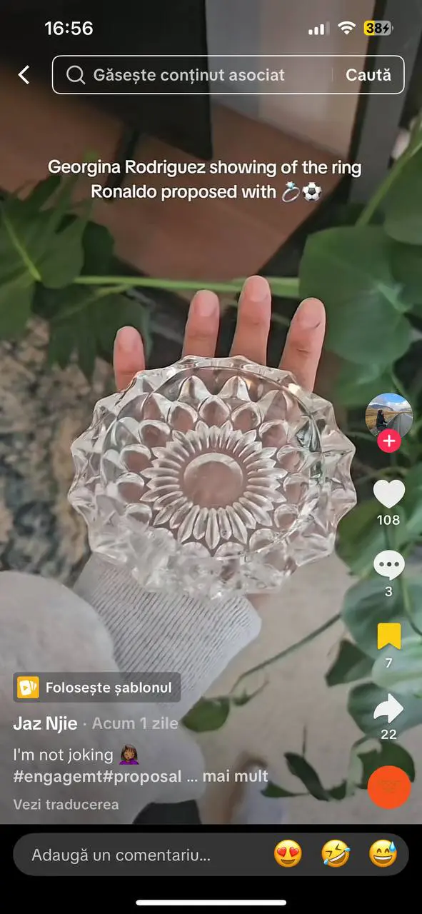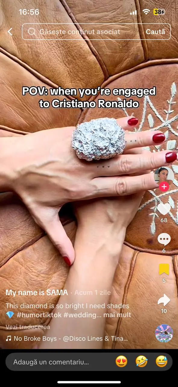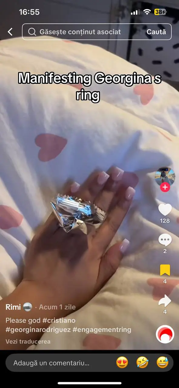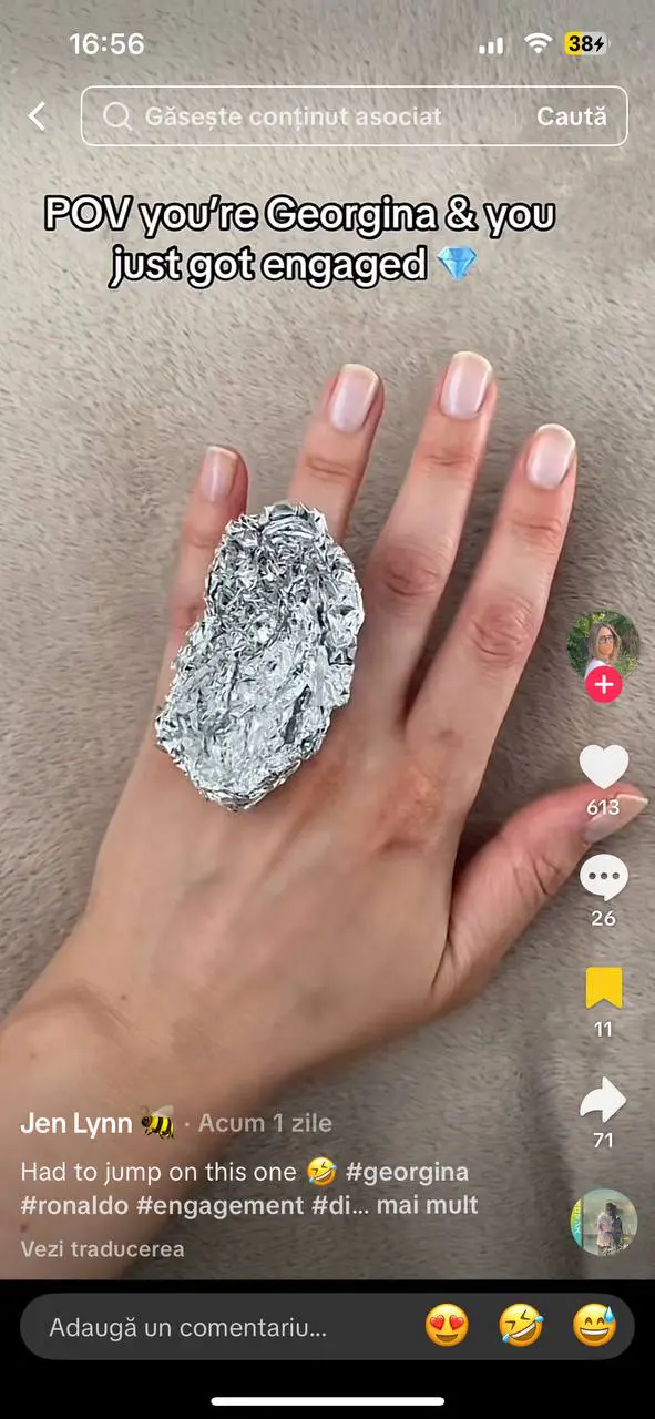 Inelul spectaculos de logodnă primit de Georgina Rodriguez de la Cristiano Ronaldo a generat un adevărat fenomen viral la nivel global, inclusiv pe TikTok, unde utilizatoarele au transformat trendul în parodii creative cu accesorii în locul pietrei prețioase.