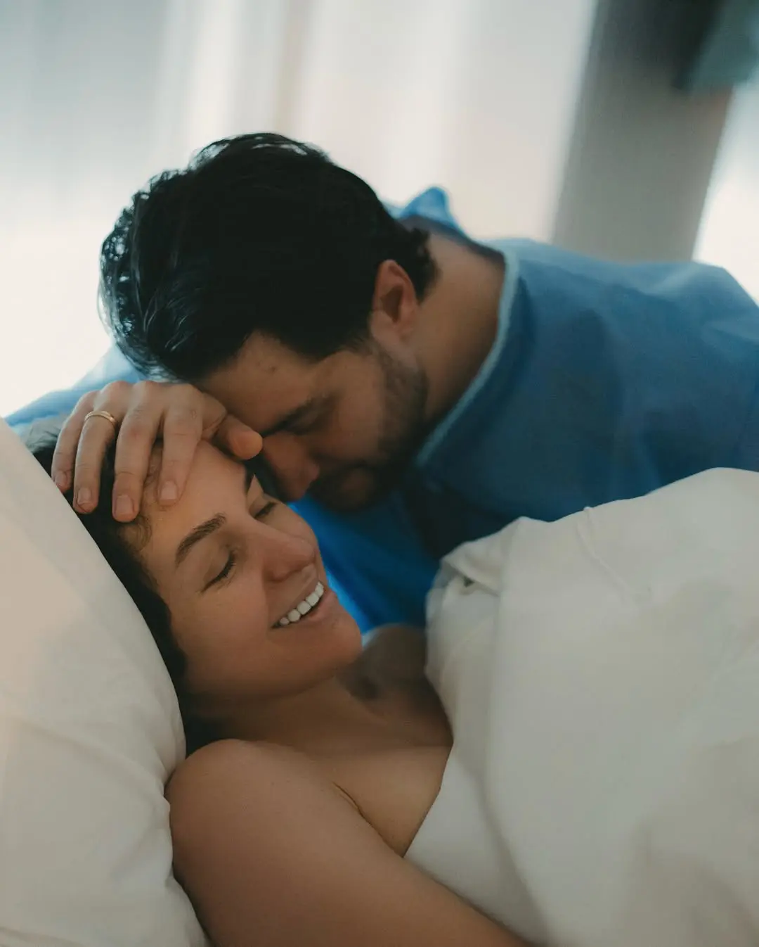 Cuplul a postat o serie de fotografii înduioșătoare din sala de naștere și de la externare, dar păstrează în secret sexul copilului.