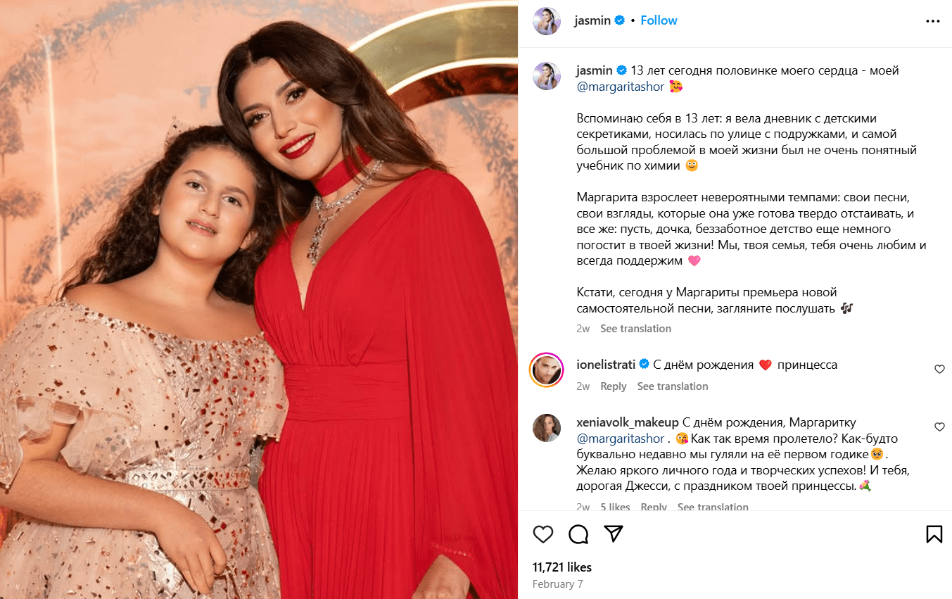 Margarita Șor, fiica cântăreței Jasmin și a oligarhului fugar Ilan Șor, a devenit din nou subiect de discuție pe rețelele de socializare, după ce mama sa a publicat o fotografie cu ocazia aniversării de 13 ani a fetei. Internauții nu au ezitat să lanseze ca de fiecare dată comentarii răutăcioase despre kilogramele în plus ale adolescentei, reaprinzând valul de critici din trecut.