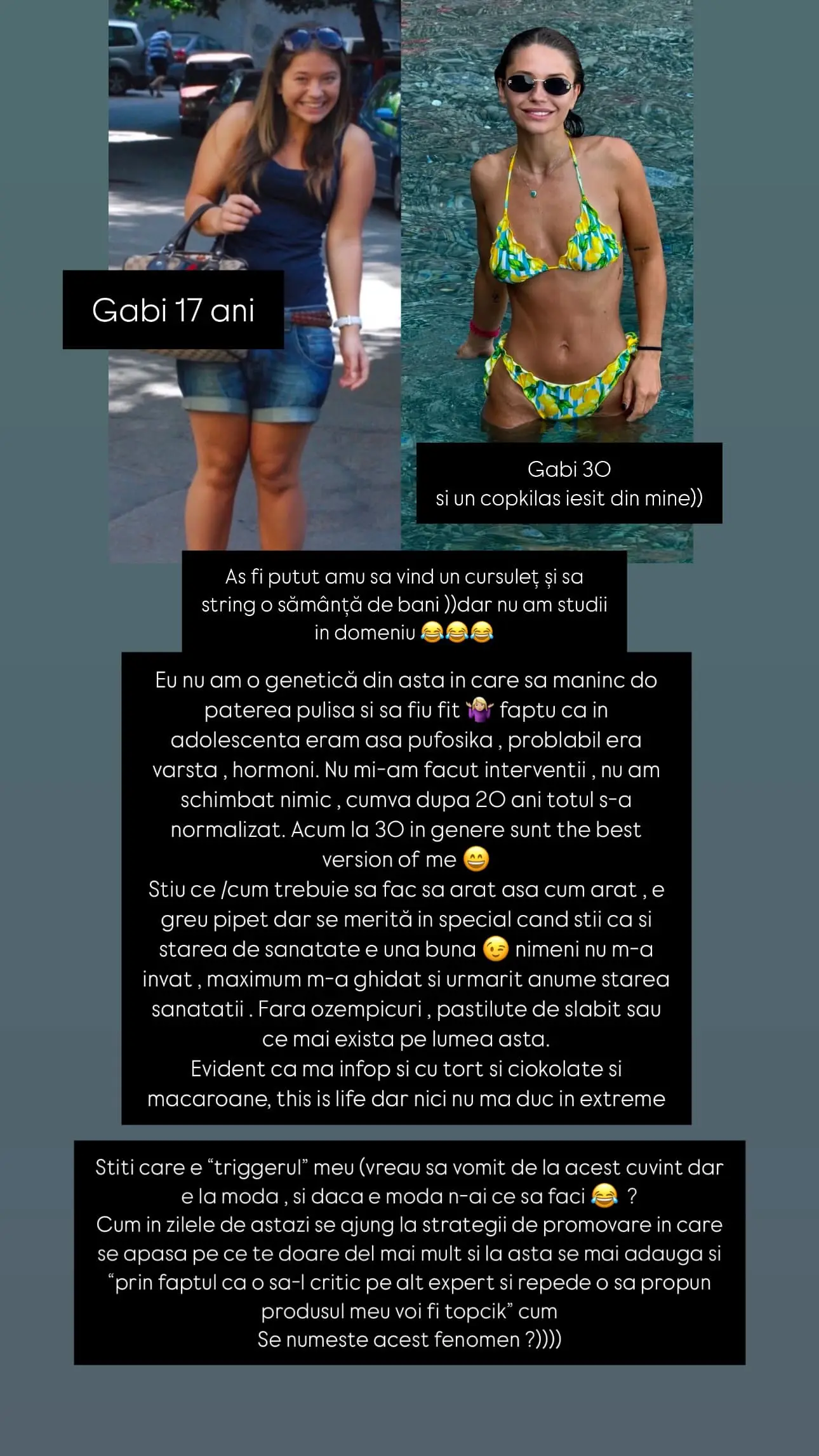Prin povestea sa, Gabriella le-a dat de înțeles femeilor și bărbaților să nu se compare cu standardele nerealiste promovate pe rețelele sociale.