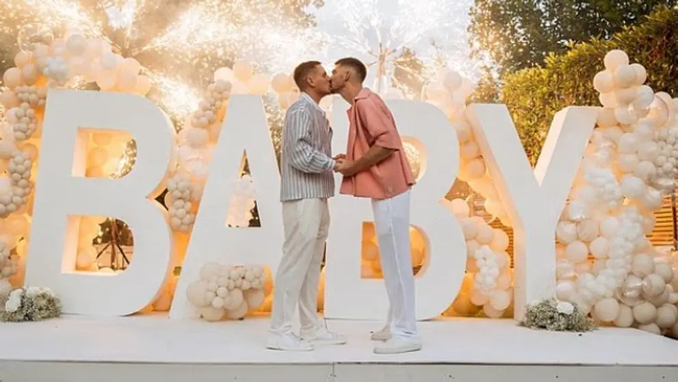 Fondatorul celebrului brand de haine „In The Style”, Adam Frisby și iubitul său, Jamie Corbett – au organizat o petrecere spectaculoasă pentru a dezvălui genul primului lor copil, care urmează să se nască prin intermediul unei mame surogat.