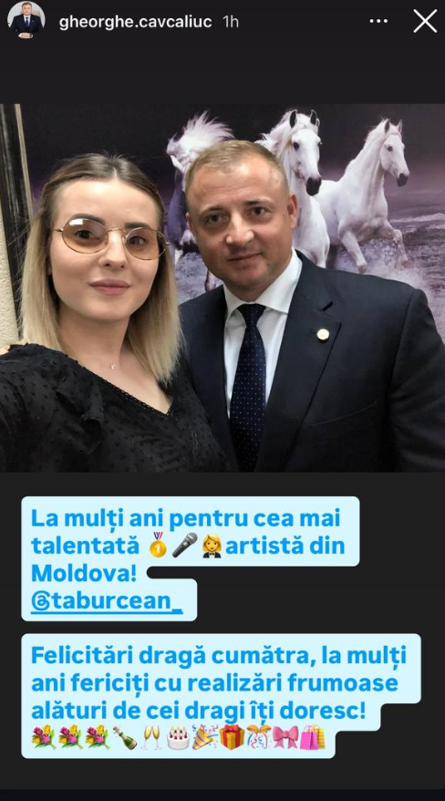 Fostul șef adjunct al IGP, liderul partidului PACE și iubitul „secret” al Svetlanei Sainsus, Gheorghe Cavcaliuc este cumătrul unei cunoscute și îndrăgite interprete de la noi din țară. „La mulți ani pentru cea mai talentată artistă”, i-a scris el Liei Taburcean.