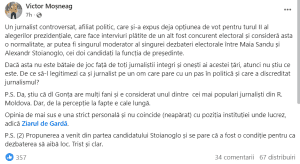 Anunțul despre faptul că jurnalistul Gheorghe Gonța, care recent a demisionat de la N4, după ce postul tv s-a disociat de postarea sa în care a îndemnat alegătorii moldoveni să voteze NU la referendum privind UE sau să nu ia buletinul deloc, va modera dezbaterile electorale înainte de turul II al alegerilor prezidențiale, dintre candidata PAS, actualul președinte Maia Sandu, și candidatul PSRM, Alexandr Stoianoglo, a provocat un val de reacții din partea colegilor de breaslă.