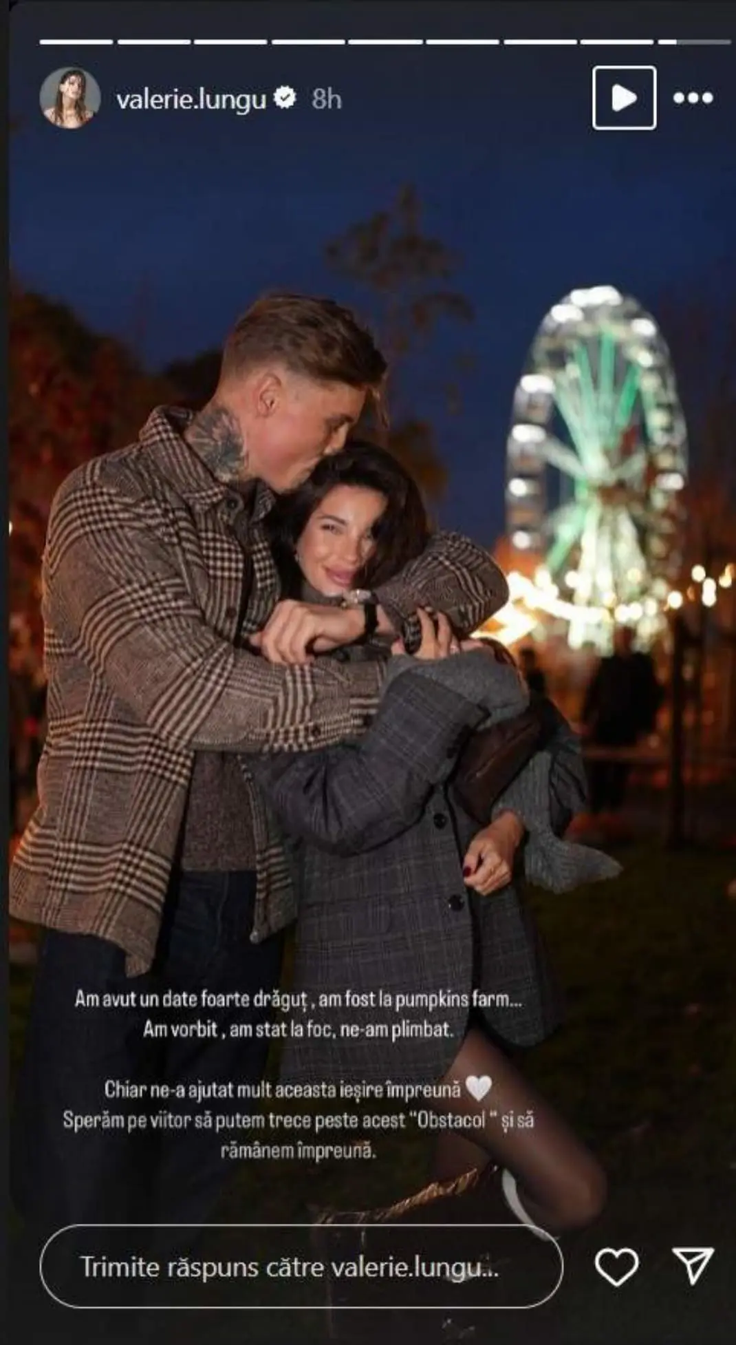 „Am avut un date foarte drăguț, am fost la pumpkins farm… Am vorbit, am stat la foc, ne-am plimbat. Chiar ne-a ajutat mult această ieșire împreună. Sperăm pe viitor să putem trece peste acest „obstacol” și să rămânem împreună”, a scris Valerie, pe contul ei de Instagram.