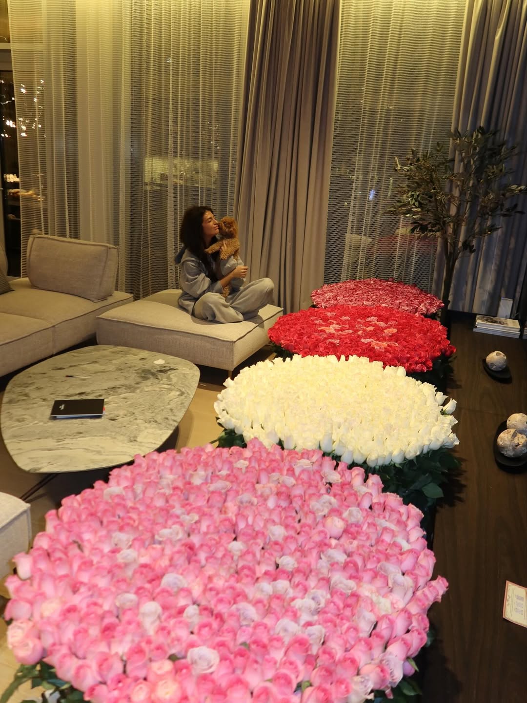 În imagini se pot observa patru buchete imense de flori, cel mai probabil trandafiri, în culori diferite: alb, roz, roșu și corai.