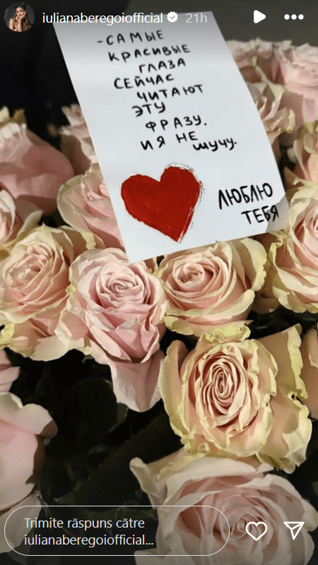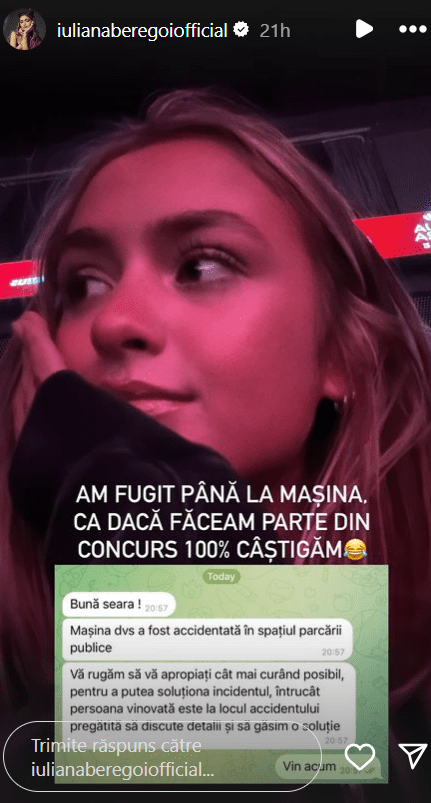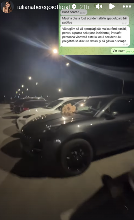 În acest weekend, Iuliana a primit un mesaj care a alarmat-o, nu glumă, prin care era anunțată că cineva i-a avariat mașina, un Porsche, în parcarea de la Arena Chișinău. Partea bună e că făptașul a rămas la locul incidentului și e dispus să-i compenseze daunele. Tânăra artistă care se afla la un eveniment sportiv acolo, a părăsit ca arsă tribunele și s-a îndreptat la parcare, ca în loc de o mașină accidentată să găsească un buchet de trandafiri pe capotă și un mesaj siropos, cu o declarație de dragoste.