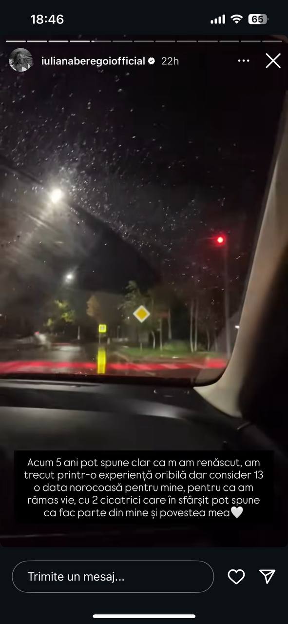 Iuliana Beregoi a ascuns ani buni incidentul din acea noapte. Ea s-a ales cu o cicatrice pe frunte, pe care vreme bună îl masca cu un leucoplaste. Artista consideră cifra 13 una norocoasă pentru ea, căci a reușit să supraviețuiască. Interpreta îndemnă urmăritorii să nu se orice în automobil cu oricine și mai cu seamă să nu depășească limita de viteză.