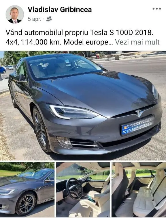 De asemenea, anul trecut, Gribincea a vândut cu 380 de mii de lei un automobil Tesla S din 2017.