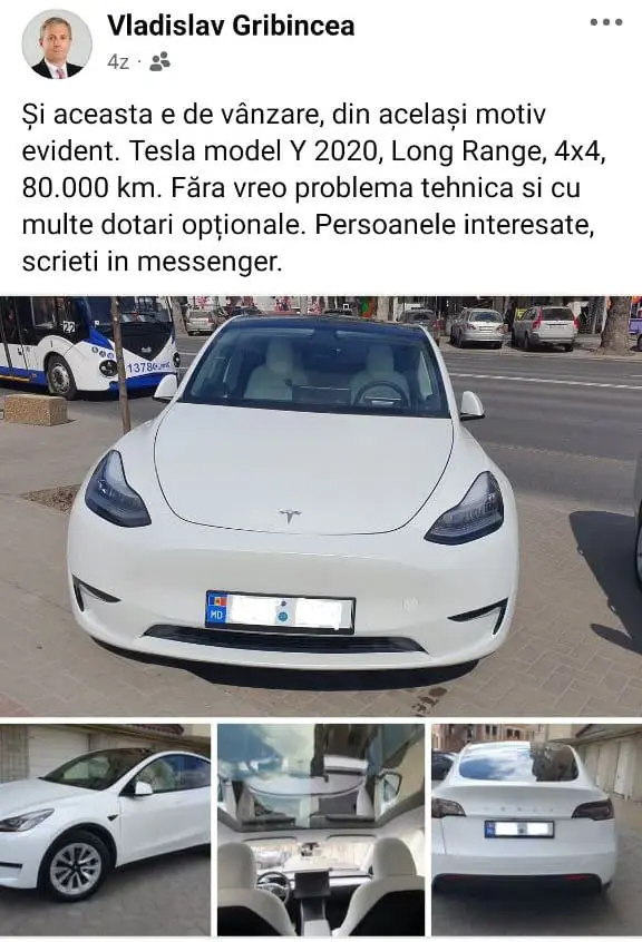 Ulterior, la 12 aprilie, Gribincea a anunțat că își vinde și cel de-al doilea automobil – Tesla Y din 2020. În declarație, acesta a fost evaluat la 45 de mii de euro.