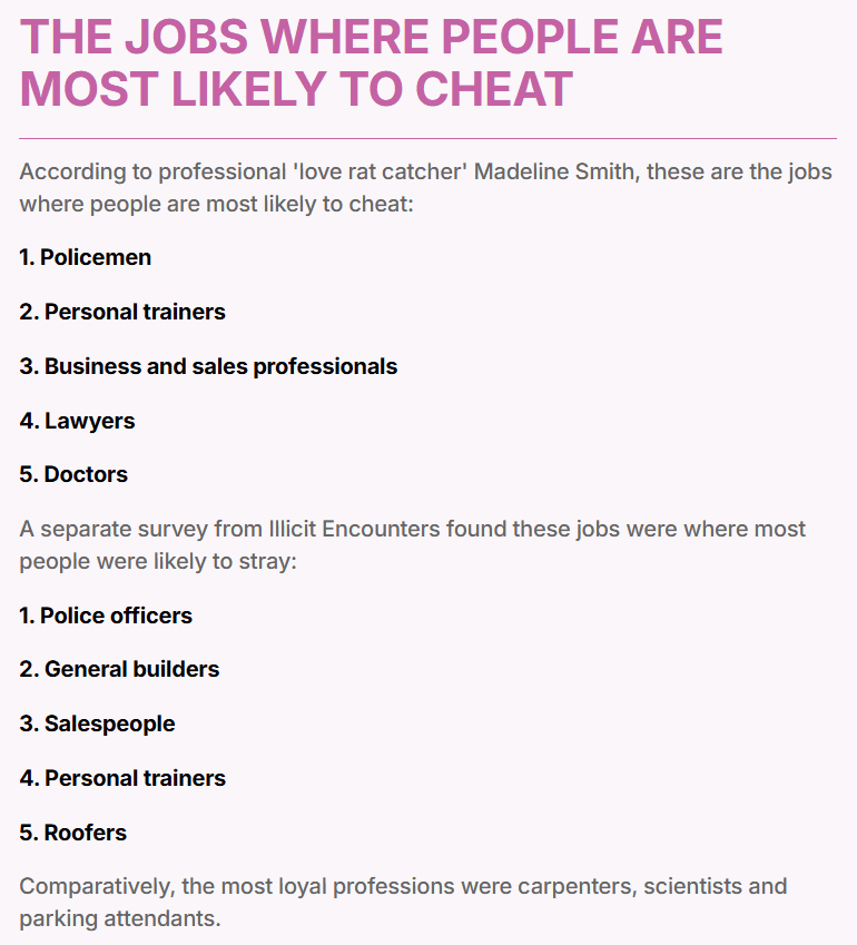 Pe primul loc se află polițiștii, o profesie care, deși simbolizează autoritatea și integritatea, pare să ascundă multe secrete. „Am prins peste 100 de polițiști până acum. Lucrează în ture și deseori își justifică acțiunile prin stilul lor de viață agitat”, explică Madeline. Studiile efectuate de platforma „Illicit Encounters” susțin concluziile ei: 63% dintre polițiști au recunoscut că au înșelat în ultimul an.