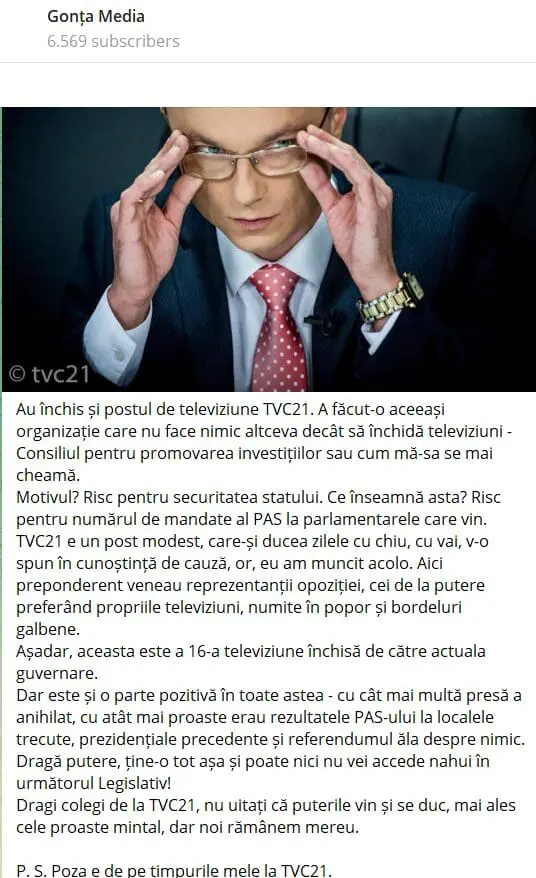 Jurnalistul Gheorghe Gonța a criticat suspendarea postului de televiziune TVC21, sugerând că decizia ar avea motive politice. Acesta susține că postul era modest și găzduia preponderent reprezentanți ai opoziției, fapt ce ar fi deranjat actuala guvernare. „Era risc pentru numărul de mandate al PAS la parlamentarele care vin”, a scris Gonța pe rețele.