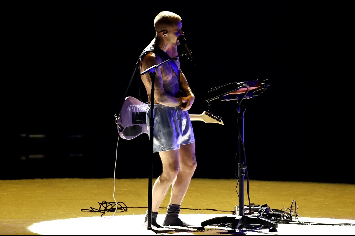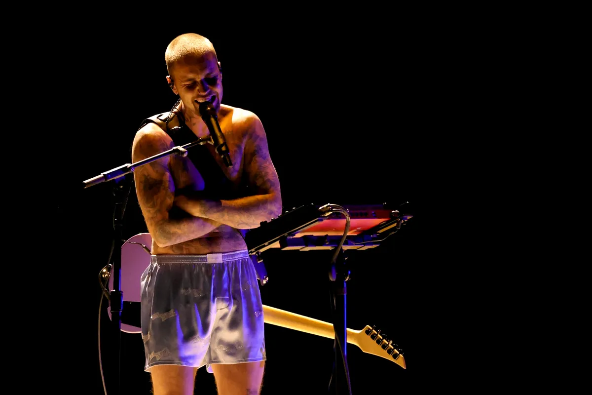 Justin Bieber a șocat audiența după ce a cântat la Premiile Grammy 2026 purtând doar boxeri și șosete, etalând numeroase sale tatuaje de pe corp, inclusiv unul nou, pe spate, dedicat soției sale.