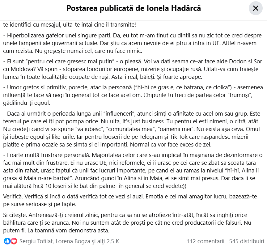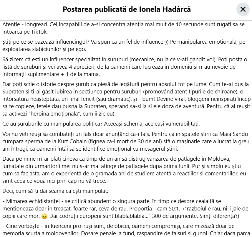 Scriitoarea Ionela Hadârcă a publicat un mesaj amplu pe rețelele de socializare în care a analizat mecanismele de influențare a opiniei publice, comparând tehnicile influencerilor din mediul online cu metodele folosite în manipularea politică. Ea a explicat că, indiferent de domeniu, succesul unor astfel de campanii se bazează pe exploatarea emoțiilor, a slăbiciunilor și a orgoliului oamenilor.