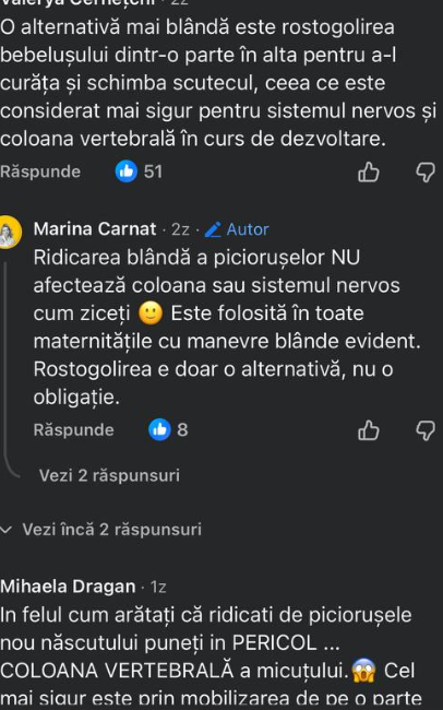 Video-ul care a stârnit cele mai multe controverse în comentarii este cel în care femeia arată trucuri despre cum să schimbi scutecul fără accidente. Internautele însă au luat-o la rost în comentarii pentru că ridică bazinul copilului, fapt ce ar putea afecta coloana vertebrală și că utilizează șervețele umede, pe când este mai indicat spălarea cu apă caldă.