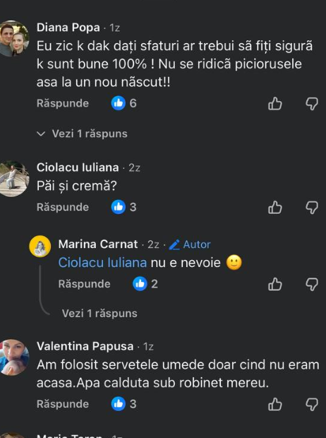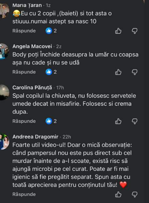 Video-ul care a stârnit cele mai multe controverse în comentarii este cel în care femeia arată trucuri despre cum să schimbi scutecul fără accidente. Internautele însă au luat-o la rost în comentarii pentru că ridică bazinul copilului, fapt ce ar putea afecta coloana vertebrală și că utilizează șervețele umede, pe când este mai indicat spălarea cu apă caldă.