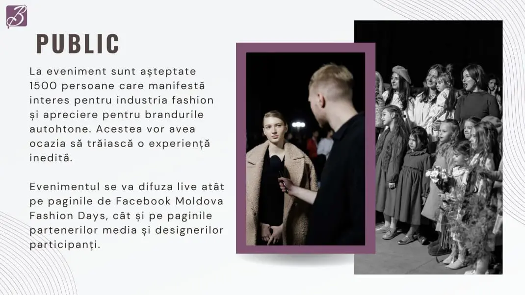 Evenimentul va fi transmis în direct pe paginile de Facebook Moldova Fashion Days și ale partenerilor media, asigurând o acoperire extinsă și oferind oportunitatea de a achiziționa articolele vestimentare prezentate direct de la fața locului.