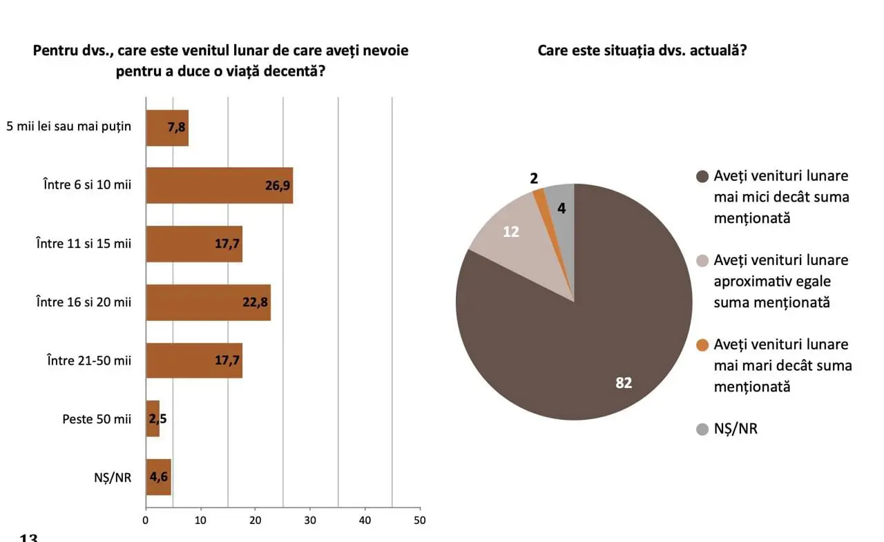 Între șase și zece mii de lei – de atât au nevoie aproape 27% dintre cetățeni pentru a duce un trai decent în Republica Moldova. Cu toate acestea, majoritatea spun că au venituri lunare mai mici decât această sumă, arată rezultatele Barometrului Social Politic, realizat de IMAS la comanda Independent News România și prezentat publicului marți, 15 aprilie.