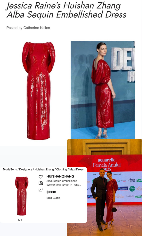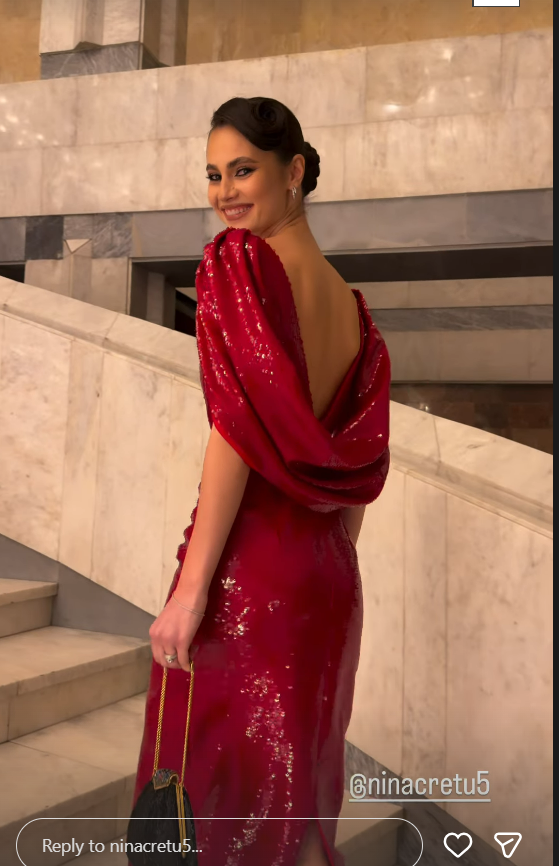 Nina a purtat o rochie spectaculoasă, cu un aer clar de eveniment de gală. Rochia este într-un roșu intens, foarte strălucitor. Materialul pare acoperit cu paiete sau un finisaj lucios, care reflectă lumina și creează un efect glamour. Are o croială lungă, care urmărește linia corpului și evidențiază silueta influencerei. Umerii sunt accentuați prin elemente voluminoase, sculpturale, care dau rochiei un aer dramatic. În spate apare un decolteu adânc, cu un element drapat care cade elegant peste spate.