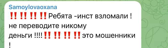„Instagramul e spart. Nu transferați bani nimănui. Sunt escroci!”, scrie pe canalul ei de Telegram Oxana Samoylova.
