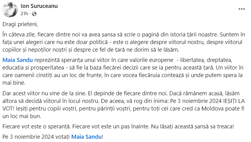 „Dragi prieteni, în câteva zile, fiecare dintre noi va avea șansa să scrie o pagină din istoria țării noastre. Suntem în fața unei alegeri care nu este doar politică – este o alegere despre viitorul nostru, despre viitorul copiilor și nepoților noștri și despre ce fel de țară ne dorim să le lăsăm. Maia Sandu reprezintă speranța unui viitor în care valorile europene – libertatea, dreptatea, educația și prosperitatea – să fie la baza fiecărei decizii care se ia pentru această țară. Un viitor în care oamenii cinstiți au un loc de frunte, în care vocea fiecăruia contează și unde putem spera la mai bine. Dar acest viitor nu vine de la sine. El depinde de fiecare dintre noi. Dacă rămânem acasă, lăsăm altora să decidă viitorul în locul nostru. De aceea, vă rog din inima: Pe 3 noiembrie 2024 IEȘIȚI LA VOT! Ieșiți pentru copiii voștri, pentru părinții voștri, pentru toți cei care cred ca Moldova poate fi un loc mai bun. Fiecare vot este o speranță. Fiecare vot este un pas înainte. Nu lăsați această șansă sa treaca! Pe 3 noiembrie 2024, votați Maia Sandu!, a scris Ion Suruceanu.