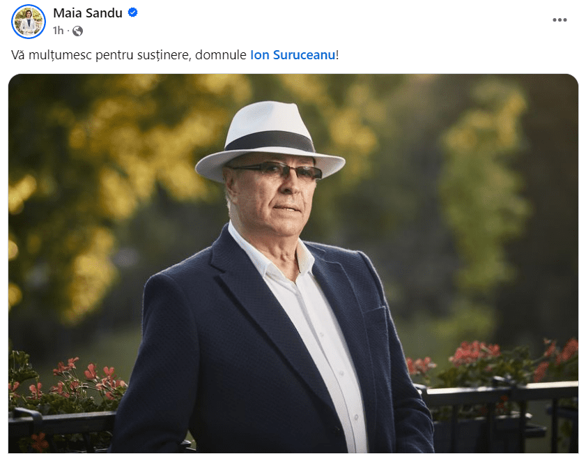 Interpretul Ion Suruceanu, în vârstă de 75 de ani, a publicat marți seara, 22 octombrie curent, pe rețelele sociale un mesaj de susținere pentru Maia Sandu (candidata PAS) în cursa prezidențială pe care o împarte în turul II cu Alexandr Stoianoglo (candidatul PSRM). A doua zi, președinta i-a adus mulțumiri.