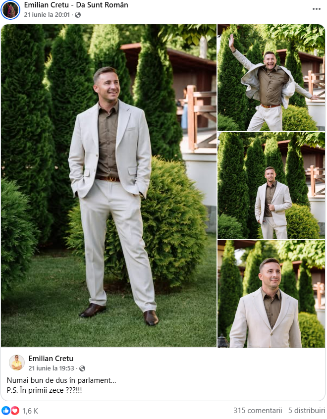 Emilian Crețu și-a încins urmăritorii la început de săptămână cu o postare care pare să aibă conotație politică. Actorul a publicat câteva fotografii în costum și a scris că e bun de dus în Parlament. Se întâmplă în contextul în care partidul de guvernare – PAS – s-a înconjurat cu vedete pentru alegerile parlamentare din 28 septembrie 2025.