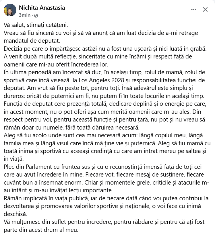 Amintim că la începutul aceste săptămâni Anastasia Nichita a anunțat că își retrage mandatul de parlamentar, din cauza că nu reușește să îmbine, în această perioadă, rolul de mamă, cariera sportivă și responsabilitățile din Legislativ.