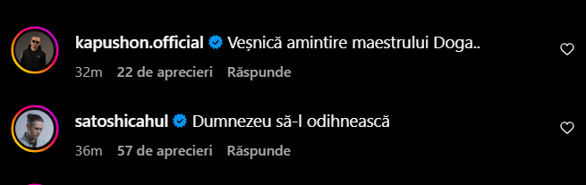 În comentarii la postarea Maiei Sandu, au venit cu mesaje de condoleanțe rapperii Kapushon și Satoshi.